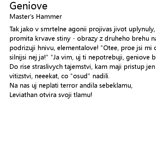| Tak jako v smrtelne agonii projivas jivot uplynuly, posledni zapad slunce promita krvave stiny - obrazy z druheho brehu na stini pohyblive, uzkost podrizuji hnivu, elementalove! "Otee, proe jsi mi opustil?" "Protoje vira tva je silnijsi nej ja!" "Ja vim, uj ti nepotrebuji, geniove bez pohrbu vchazeji." | |