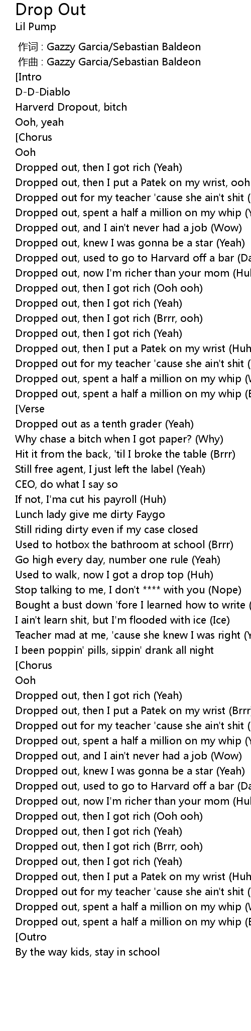 | [00:12.34] | Dropped out for my teacher ' cause she ain' t shit Huh |