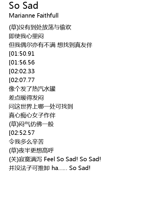 | [02:59.38][01:50.91][00:53.83] | guan gu dan de ni Feel So Sad! So Sad! |