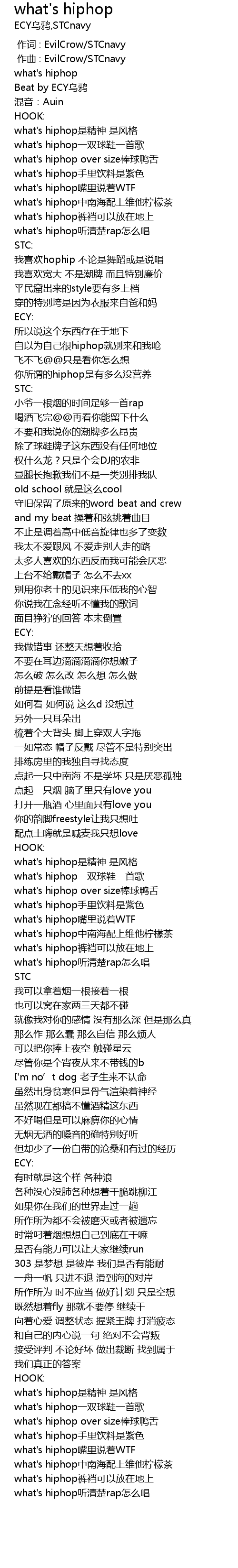 | [00:25.574] | what's hiphop听清楚rap怎么唱 |