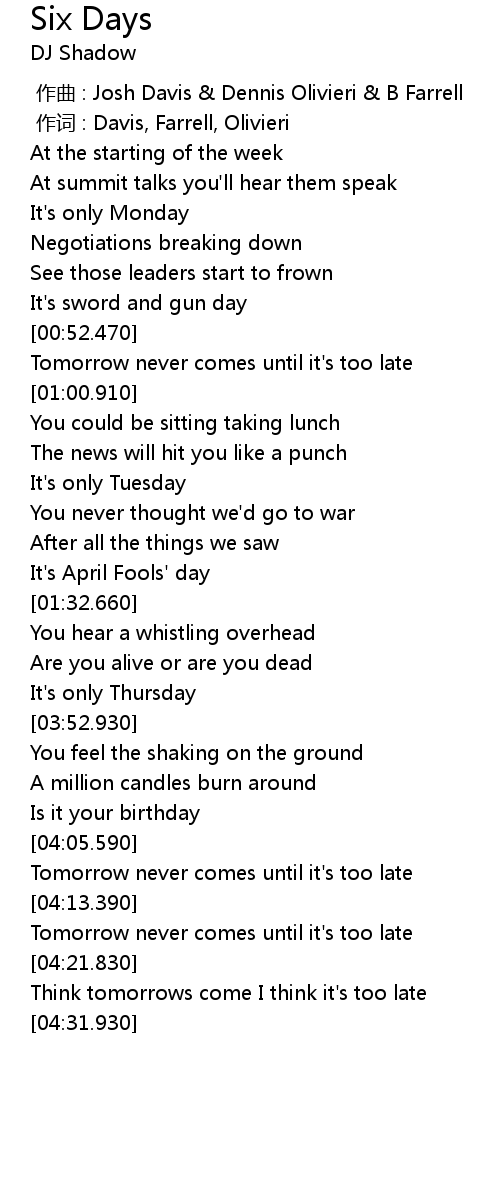 | [00:56.790] | Tomorrow never comes until it' s too late |