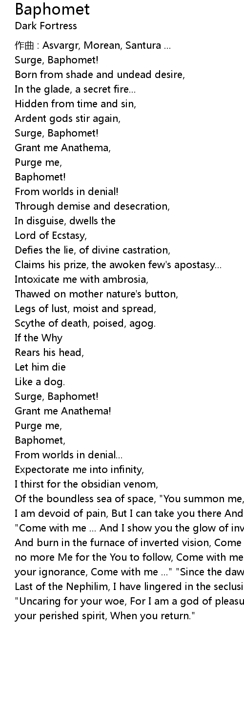 | Of the boundless sea of space, "You summon me, In childish play and insect time, I am devoid of pain, But I can take you there And beyond, if this be your wish." "Come with me ... And I show you the glow of inverted stars, Come with me ... And burn in the furnace of inverted vision, Come with me ... And there will be no more Me for the You to follow, Come with me ... I am in awe of the extent of your ignorance, Come with me ..." "Since the dawn of guilt, my path has changed, Last of the Nephilim, I have lingered in the seclusion, Of wood and fear..." "Uncaring for your woe, For I am a god of pleasure, I will not shed a tear On your perished spirit, When you return." |