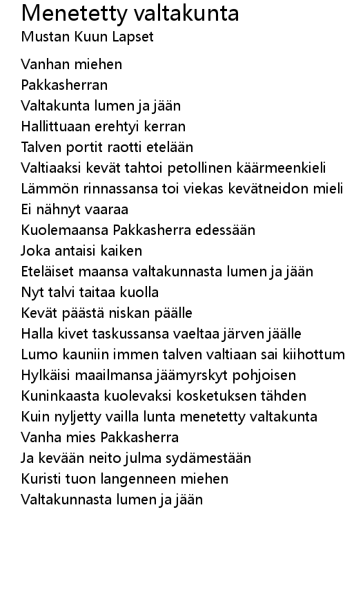 | Kuin nyljetty vailla lunta menetetty valtakunta | |