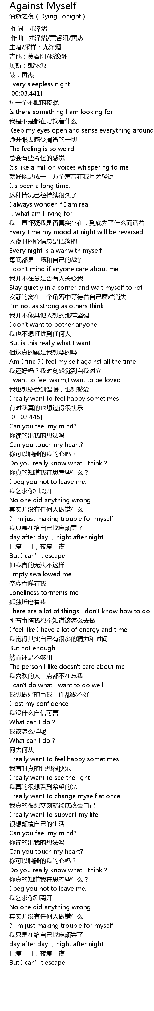 | [00:53.945] | Am I fine?I feel my self against all the time |