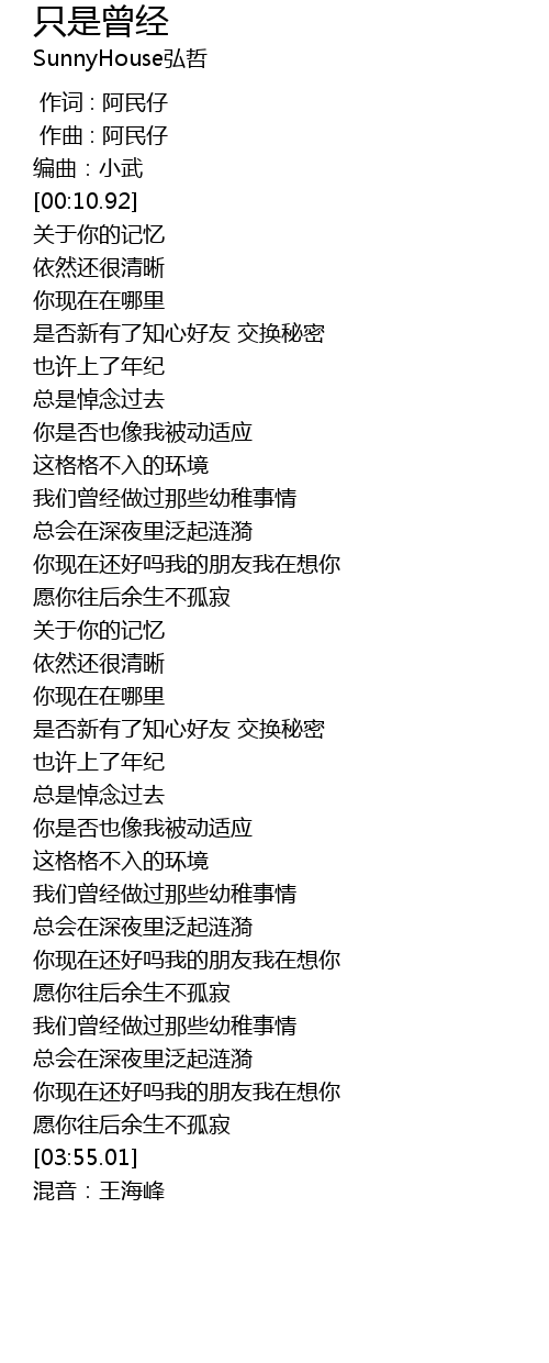 | [03:12.92] | 你现在还好吗我的朋友我在想你 |