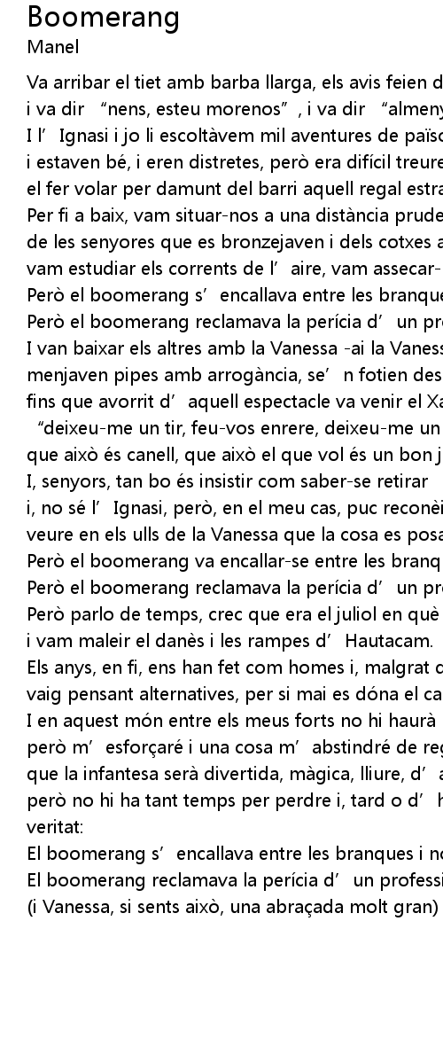 | Pero el boomerang s' encallava entre les branques i no tornava mai. | |