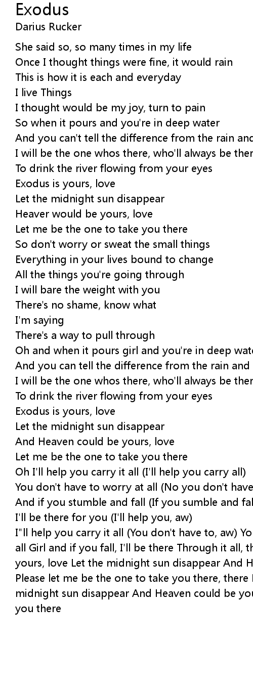 I"ll help you carry it all (You don't have to, aw) You don't have to worry at all Girl and if you fall, I'll be there Through it all, through it all Exodus is yours, love Let the midnight sun disappear And Heaven could be yours, love Please let me be the one to take you there, there Exodus is yours, love Let the midnight sun disappear And Heaven could be yours, love Let me be the one to take you there