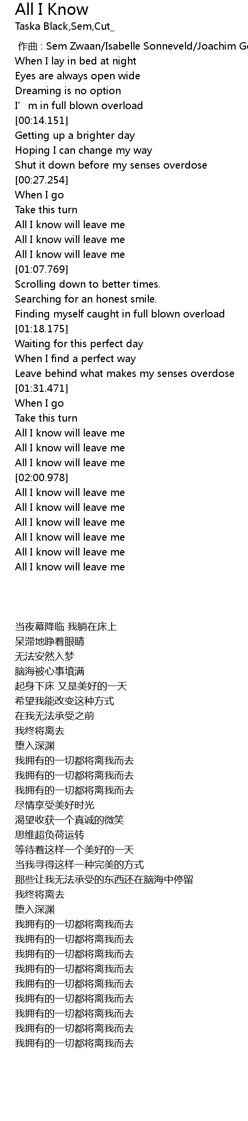 | [00:37.800] | All I know will leave me |