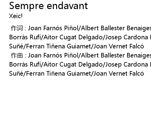 | [00:00.000] | 作词 : Joan Farnós Piñol/Albert Ballester Benaiges/Román Borràs Rufí/Aitor Cugat Delgado/Josep Cardona Pallares/Jordàn Rius Suñé/Ferran Tiñena Guiamet/Joan Vernet Falcó |