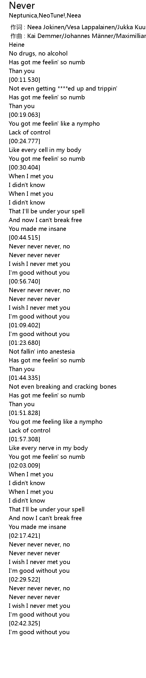 | [02:00.718] | You got me feelin' so numb |