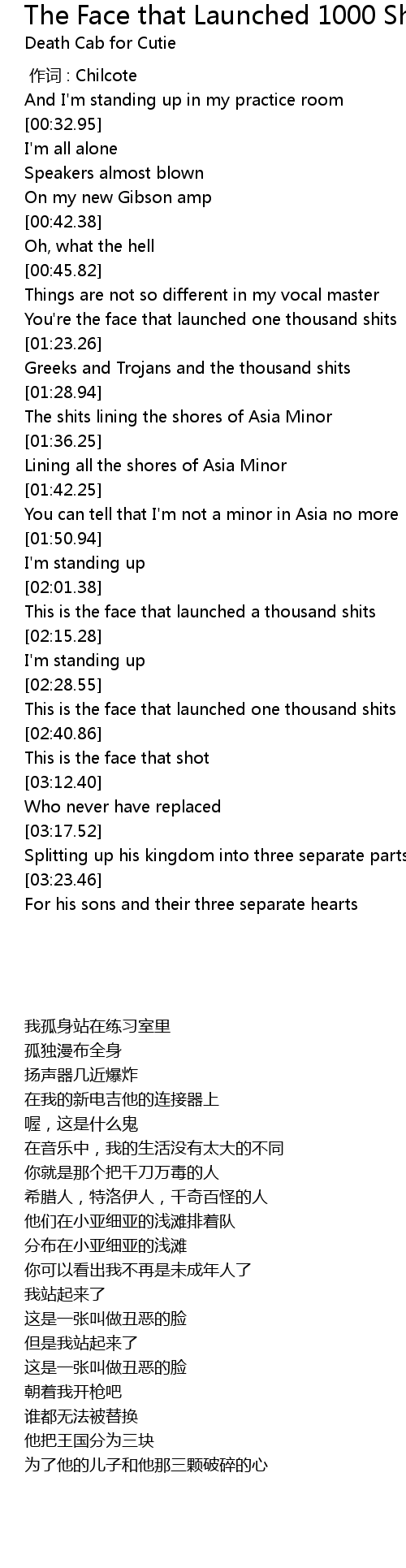 | [01:18.50] | You're the face that launched one thousand shits |