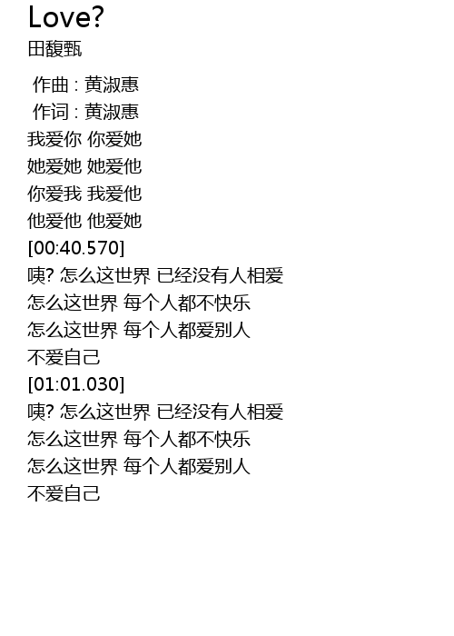 | [01:01.760] | 咦? 怎么这世界 已经没有人相爱 |