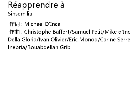 | [00:00.000] | zuo qu : Christophe Baffert Samuel Petit Mike d' Inca Jean Christophe Della Gloria Ivan Olivier Eric Monod Carine Serre Nordine Houchat Olivier Inebria Bouabdellah Grib |