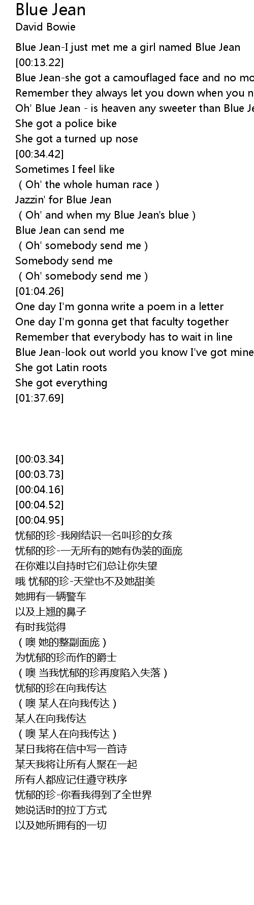 | [00:12.44] | Blue JeanI just met me a girl named Blue Jean |