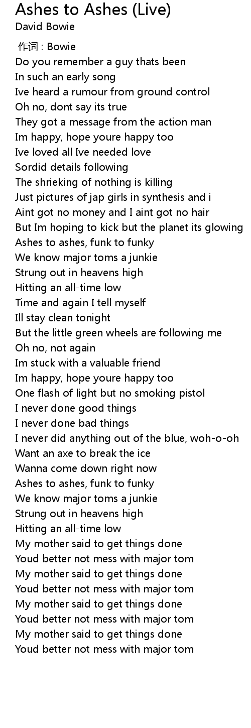 | [03:07.500] | Ashes to ashes, funk to funky |