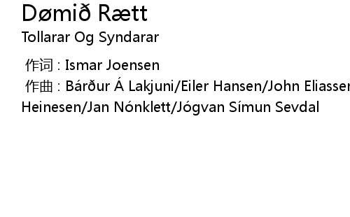| [00:00.000] | 作曲 : Bárður Á Lakjuni/Eiler Hansen/John Eliassen/Jákup Heinesen/Jan Nónklett/Jógvan Símun Sevdal |