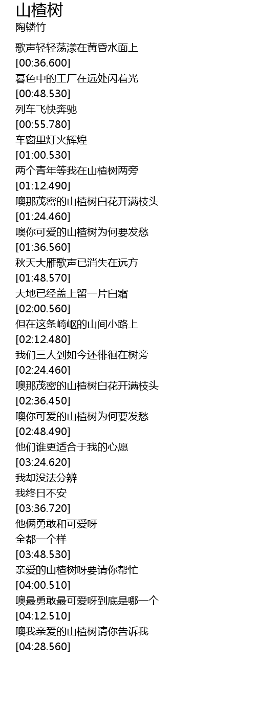 | [04:15.440] | 噢我亲爱的山楂树请你告诉我 |