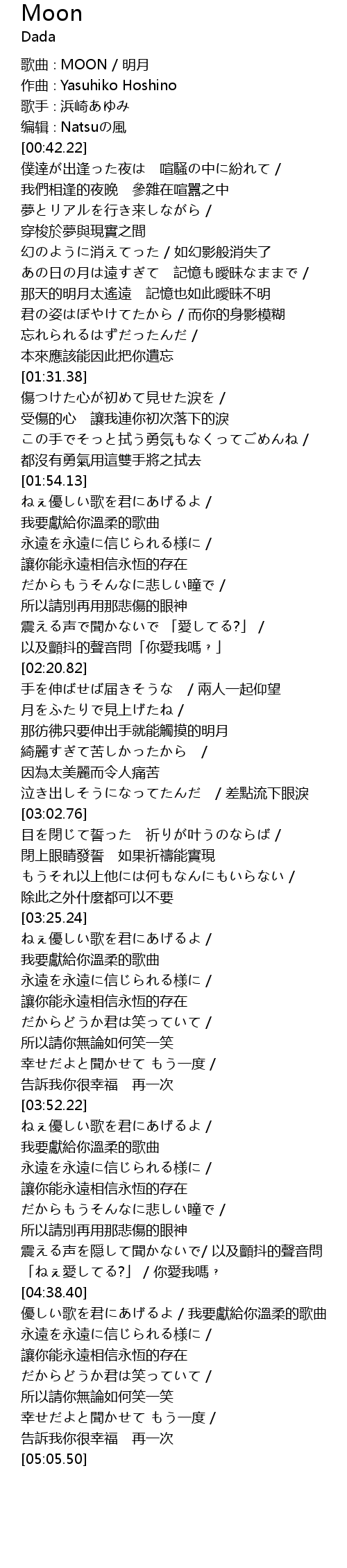 | [01:09.23] | あの日の月は遠すぎて 記憶も曖昧なままで / 那天的明月太遙遠 記憶也如此曖昧不明 |