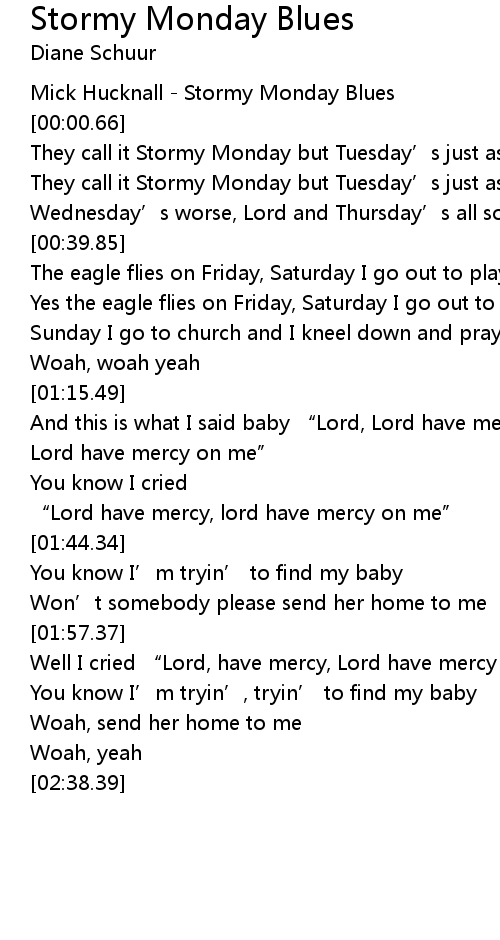| [00:00.93] | They call it Stormy Monday but Tuesday’s just as bad |