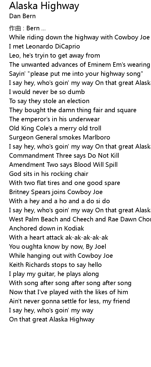 | I say hey, who's goin' my way On that great Alaska Highway | |