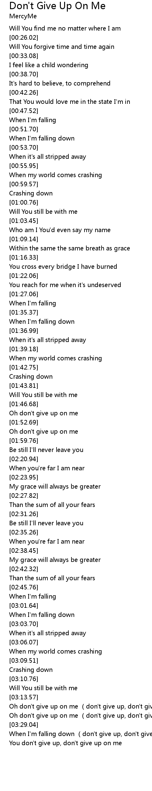 | [03:31.35] | When I' m falling down don' t give up, don' t give up on me |