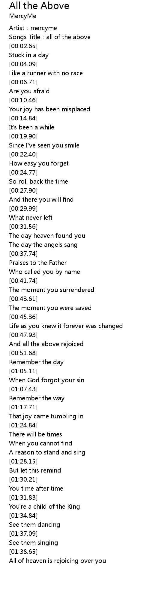 | [00:01.15] | Artist: mercyme |
