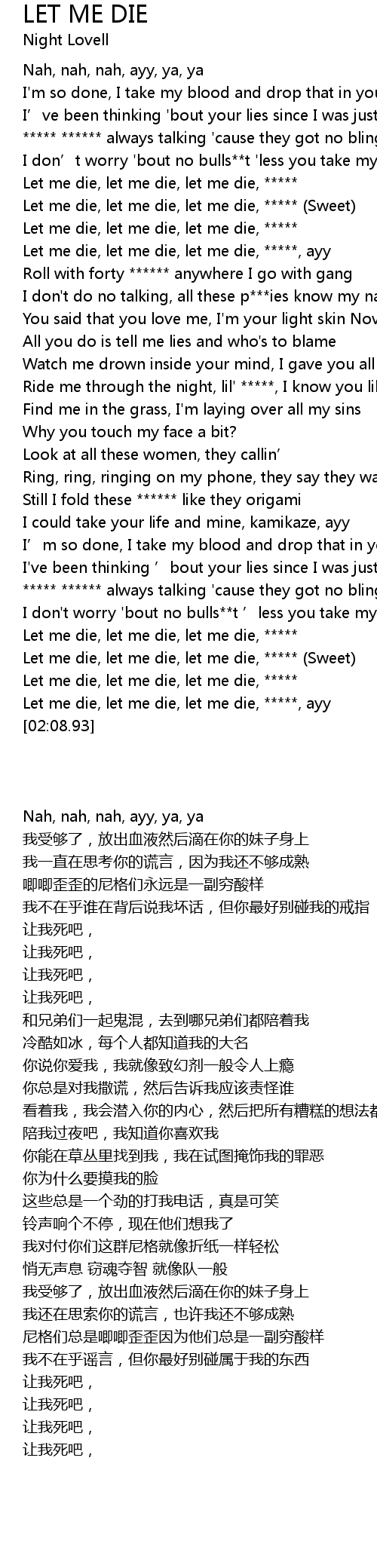 | [02:03.99] | Let me die, let me die, let me die, *****, ayy |