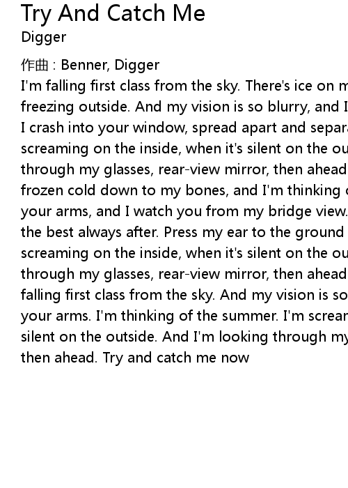 | I'm falling first class from the sky. There's ice on my windows, and it's freezing outside. And my vision is so blurry, and I feel like a snowflake. When I crash into your window, spread apart and separate into tiny little pieces. I'm screaming on the inside, when it's silent on the outside. And I'm looking, through my glasses, rear-view mirror, then ahead. Try and catch me now. I'm frozen cold down to my bones, and I'm thinking of the summer. When I fall into your arms, and I watch you from my bridge view. While I think of things to say, the best always after. Press my ear to the ground and I listen for you. I'm screaming on the inside, when it's silent on the outside. And I'm looking through my glasses, rear-view mirror, then ahead. Try and catch me now. I'm falling first class from the sky. And my vision is so blurry. When I fall into your arms. I'm thinking of the summer. I'm screaming on the inside, when it's silent on the outside. And I'm looking through my glasses, rear-view mirror, then ahead. Try and catch me now |