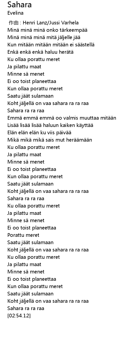 | [02:21.66] | Koht j ljell on vaa sahara ra ra raa |