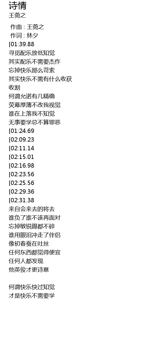 | [00:25.00][01:39.88][03:20.00] | 王菀之-诗情(粤) |