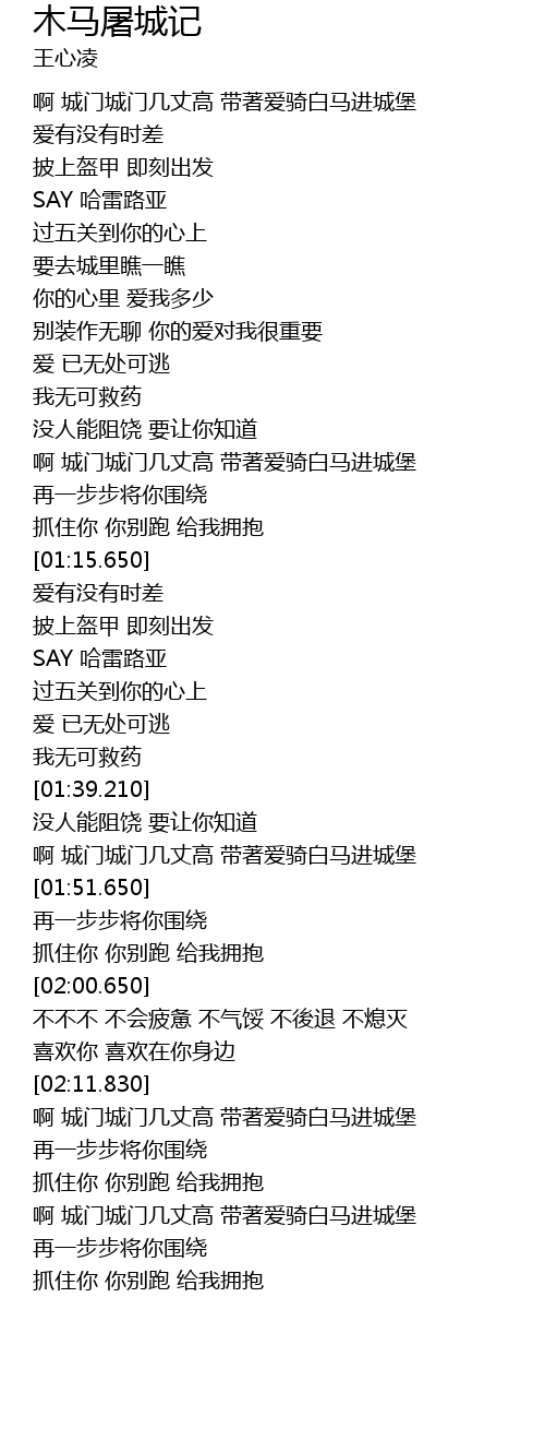| [01:43.160] | 啊 城门城门几丈高 带著爱骑白马进城堡 |