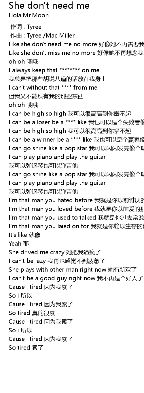 | [00:21.687] | Like she don' t need me no more hao xiang ta bu zai xu yao wo le |