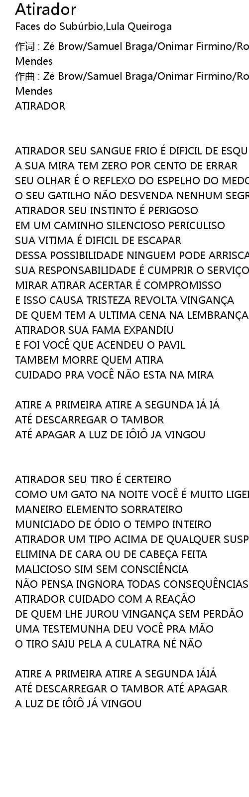 | 作词 : Zé Brow/Samuel Braga/Onimar Firmino/Roberto Mota/Felipe Pérez/Ricardo Mendes | |