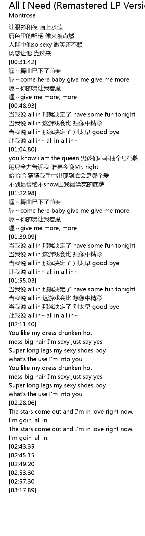 | [03:00.93][02:45.15] | 当我说 all in 那就决定了 have some fun tonight |