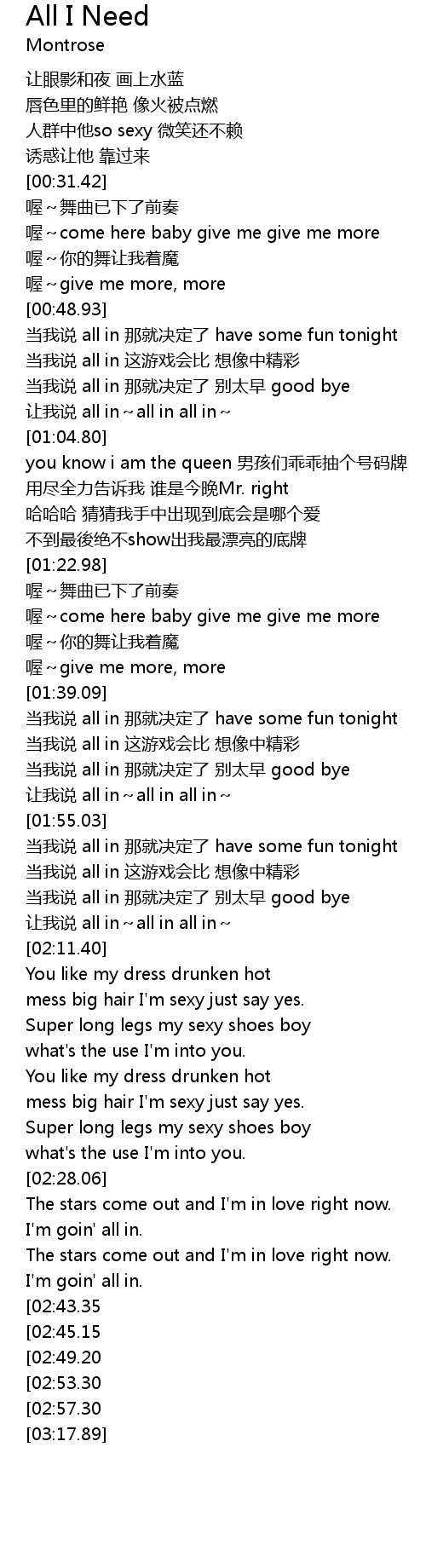 | [03:00.93][02:45.15] | dāng wǒ shuō all in nà jiù jué dìng le have some fun tonight |