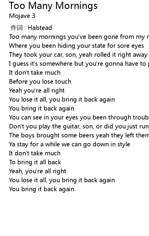 | [00:23.72] | Too many mornings you' ve been gone from my mind |