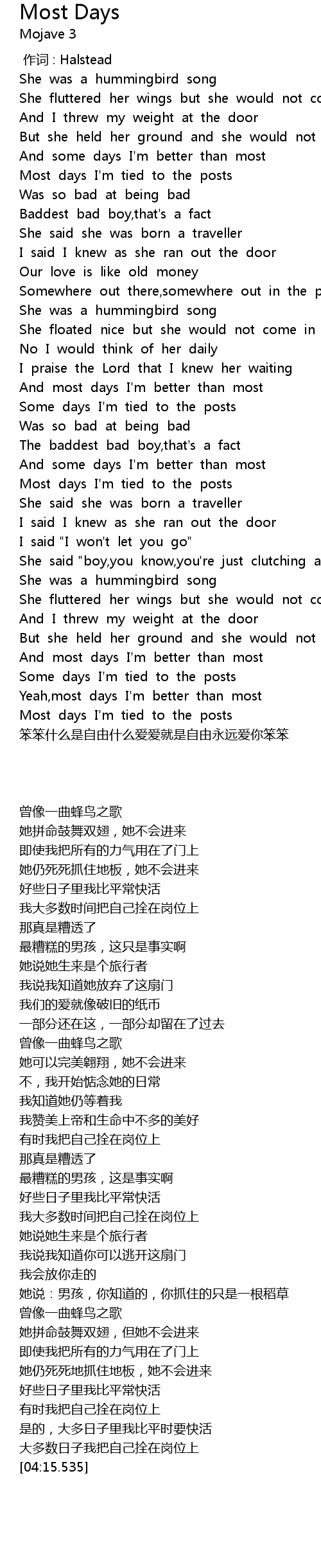 | [00:30.123] | Most days I' m tied to the posts |