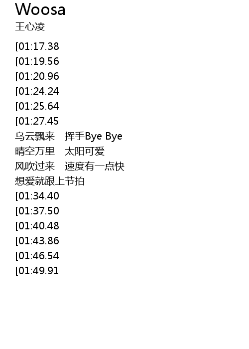 | [00:27.05][01:17.38][01:54.36][02:41.15] | Woosa Woosa |