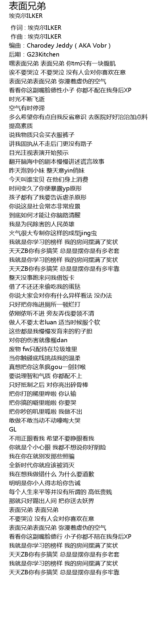 | [00:18.66] | 表面兄弟表面兄弟 弥漫着虚伪的空气 |