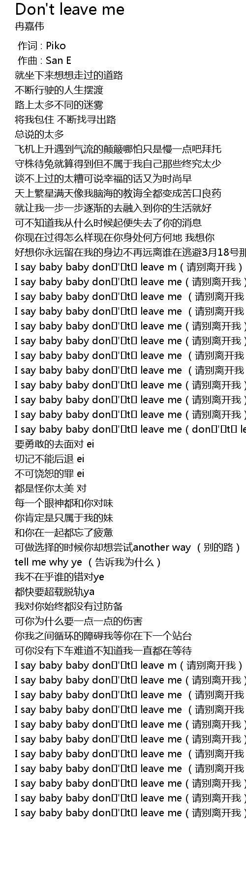 | [02:44.993] | I say baby baby don ' t leave me qǐng bié lí kāi wǒ |