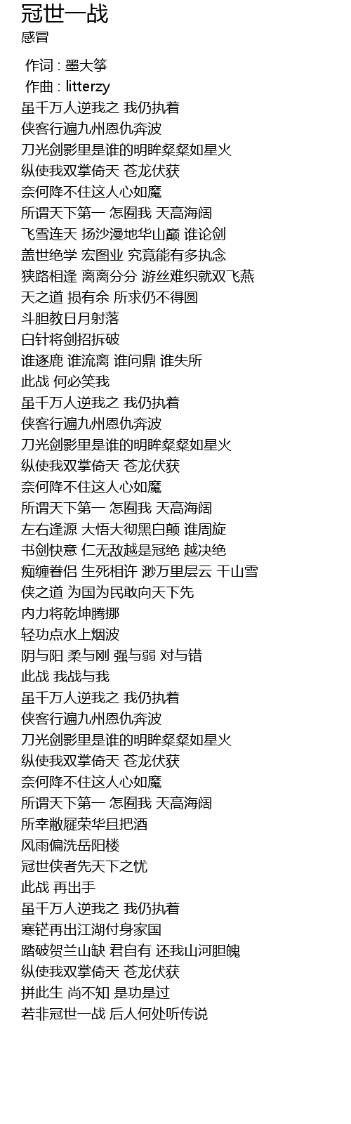 | [04:15.384] | 若非冠世一战 后人何处听传说 |