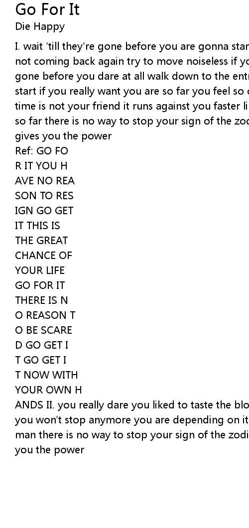 | I. wait 'till they're gone before you are gonna start the game make sure they're not coming back again try to move noiseless if you can at all wait 'till they're gone before you dare at all walk down to the entrance door where it will all start if you really want you are so far you feel so confident but the running time is not your friend it runs against you faster like it never did but you're so far there is no way to stop your sign of the zodiac gives you the power it gives you the power | |