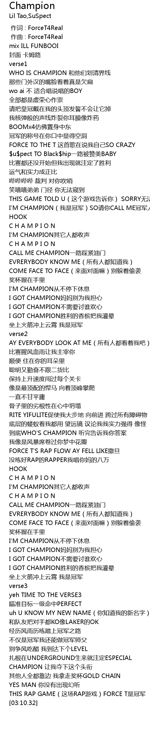 | [03:07.83] | THIS RAP GAME(这场RAP游戏)FORCE T是冠军 |