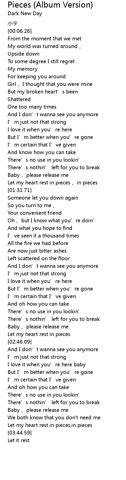 | [03:28.40] | Let my heart rest in pieces,in pieces |
