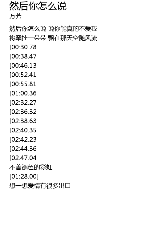 | [01:58.20][00:30.78] | rán hòu nǐ zěn me shuō nǐ zěn néng zhēn de bù ài wǒ |