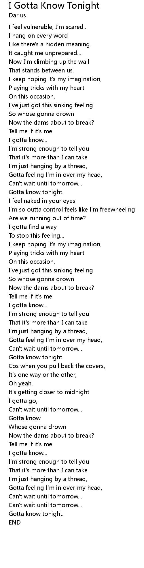 | [03:50.77] | Gotta know tonight. |