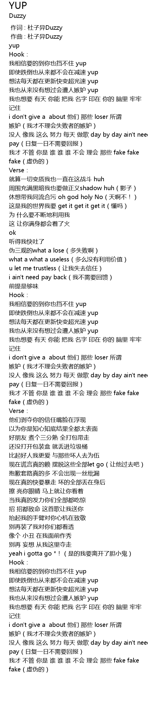 | [02:34.452] | 没人 像我 这么 努力 每天 做歌 day by day ain't need pay(日复一日不需要回报) |