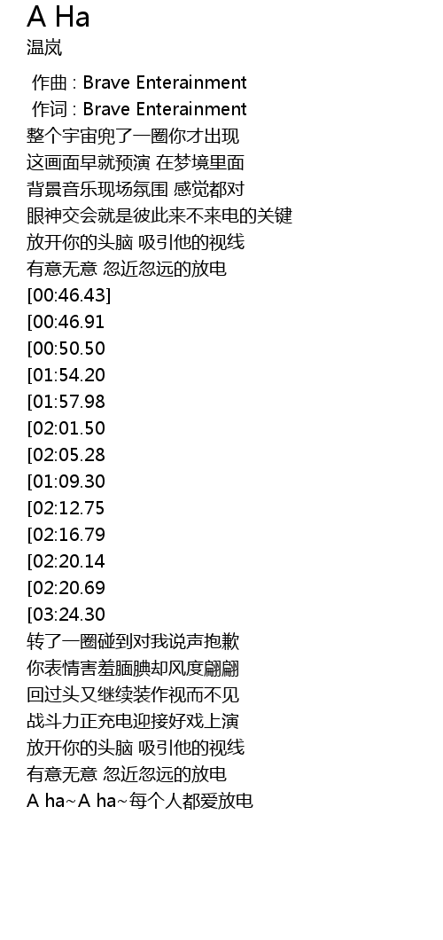 | [03:20.55][02:20.69][01:21.19] | A ha A ha A ha A ha |