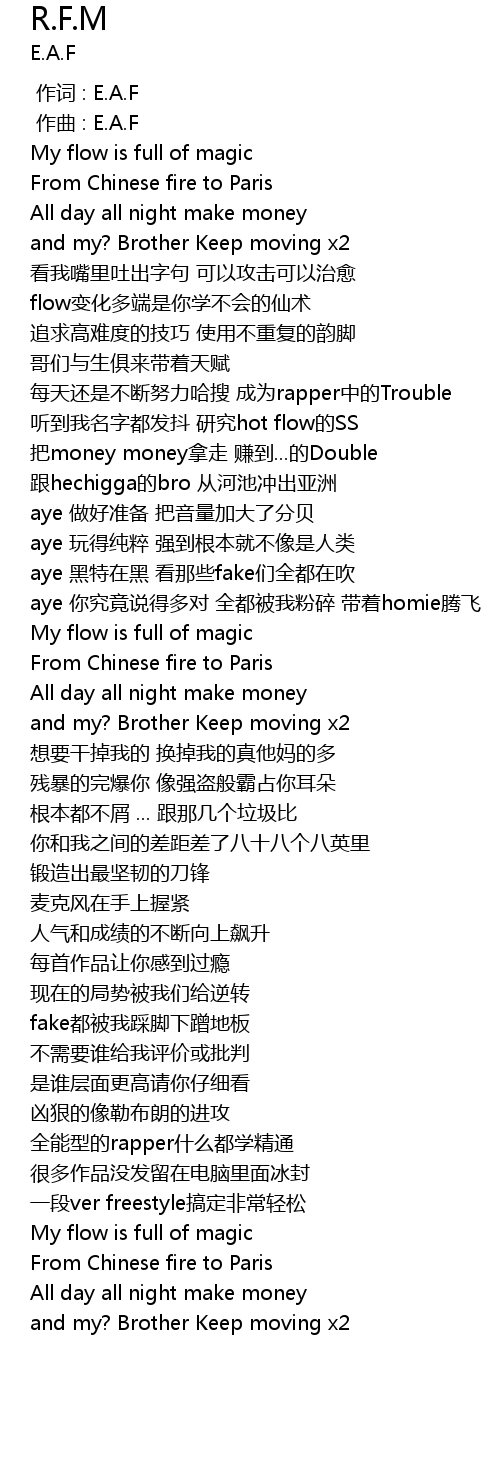 | [01:57.56] | and my? Brother Keep moving x2 |