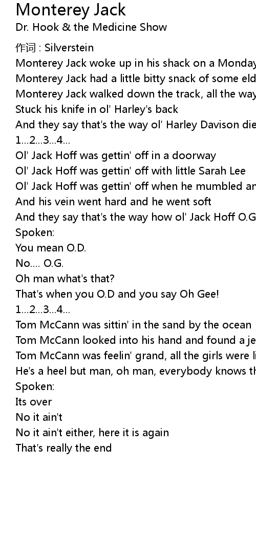 | Monterey Jack walked down the track, all the way to ol' Harley's shack | |